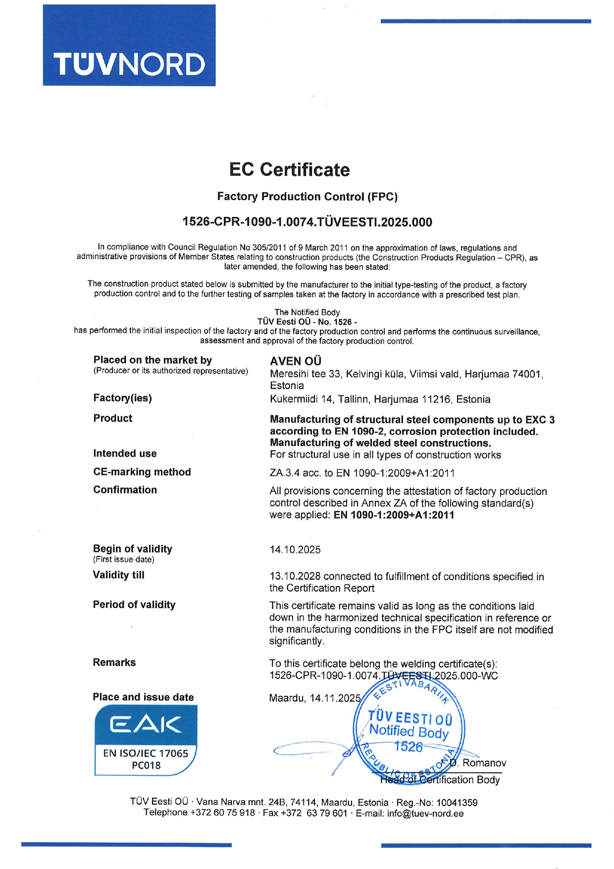 Kõik tooted ja projektid väljastatakse koos nõuetekohase dokumentatsiooniga, materjalide ja pinnakatete sertifikaatidega, toimivusdeklaratsiooni ja CE märgisega. Tootmine on sertifitseeritud ning vastab EN 1090-2:2018+A1:2024 EXC3 klassile ja EVS-EN 3834-2:2021 standarditele.
